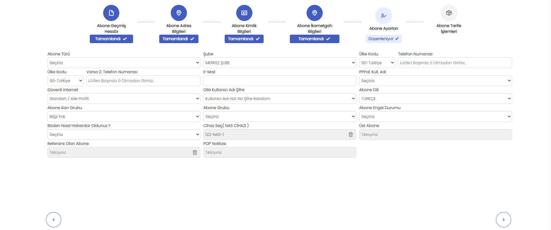Eğer abone daha önce kayıtlıysa buradan seçilir ve bilgiler otomatik doldurulur.