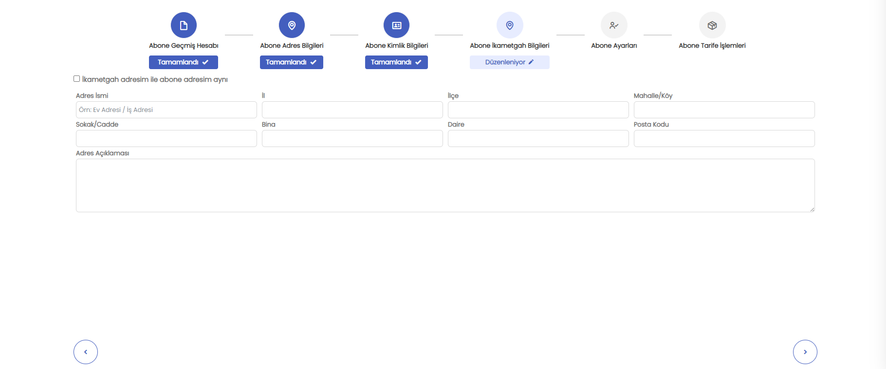 İşaretlerseniz ikametgâh adresi, abone adresi ile aynı kabul edilir (manuel tekrar girmeniz gerekmez).