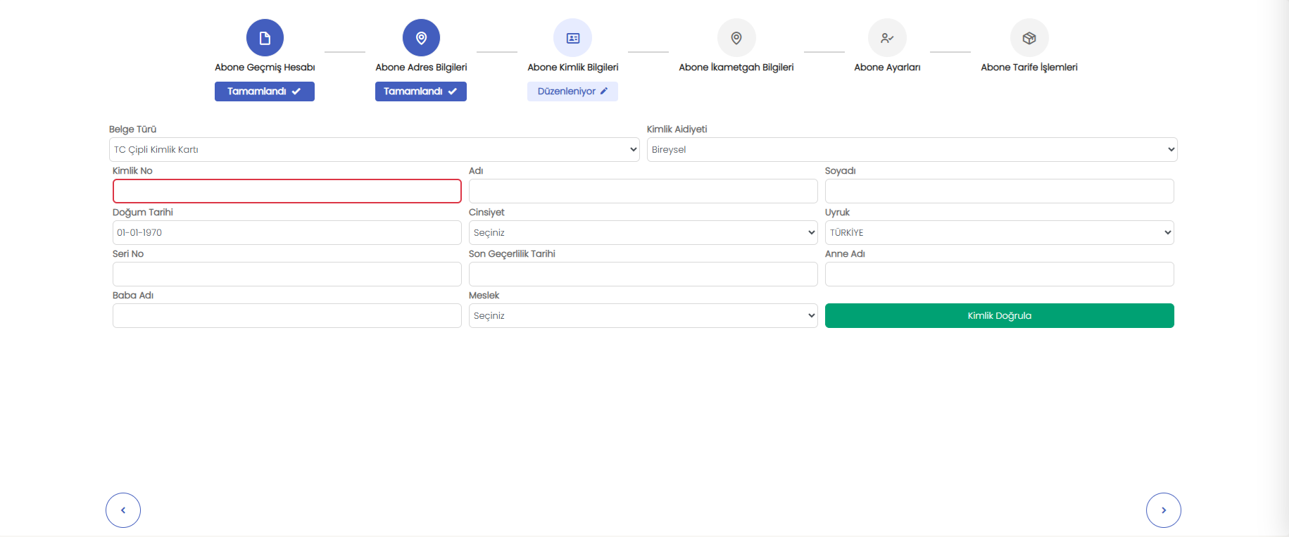 Bu ekranda amaç: Abonenin daha önce sistemde açılmış bir hesabı var mı? kontrol etmek.