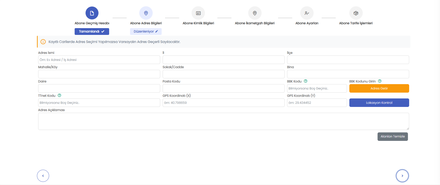 Bu ekranda amaç: Abonenin hizmet/adres bilgilerini eksiksiz toplamak ve gerekiyorsa lokasyon doğrulamak.
