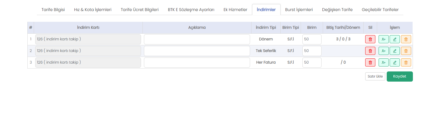 Sistem içinde hem abone detay sayfasından hem de tarife düzenleme ekranındaki “İndirimler” sekmesinden kolayca indirim tanımlayabilirsiniz.