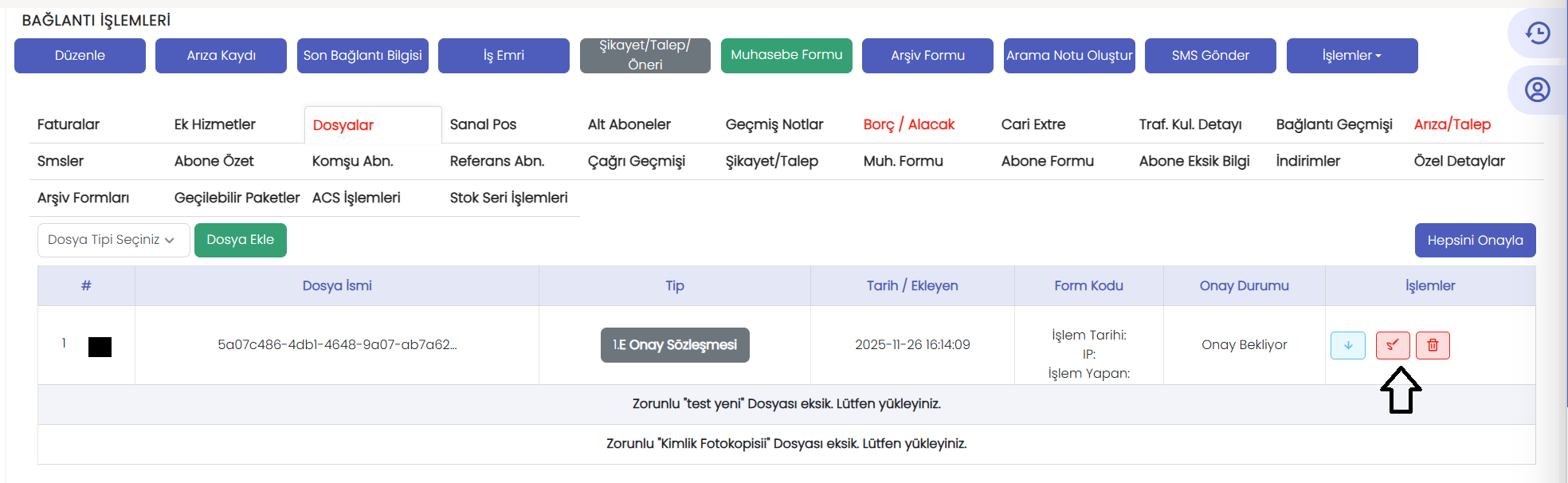 Verilen onay veya ret sonucuna ait sözleşme, otomatik olarak Wiradius üzerinde abone detay > dosyalar alanına yansımaktadır.