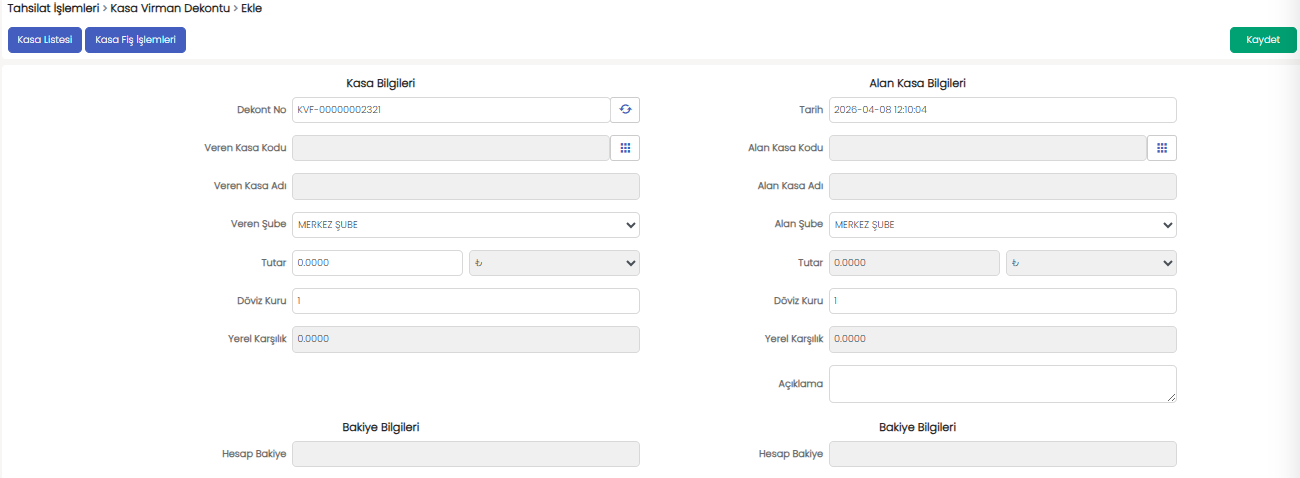 Tüm bilgileri eksiksiz doldurduktan sonra sağ üst köşede bulunan “Kaydet” butonuna tıklayarak kasa virman fişini oluşturabilirsiniz.