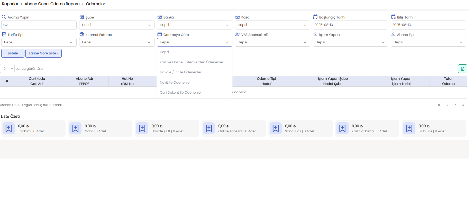İsterseniz tüm ödeme tiplerini toplu olarak listeleyebilirsiniz.