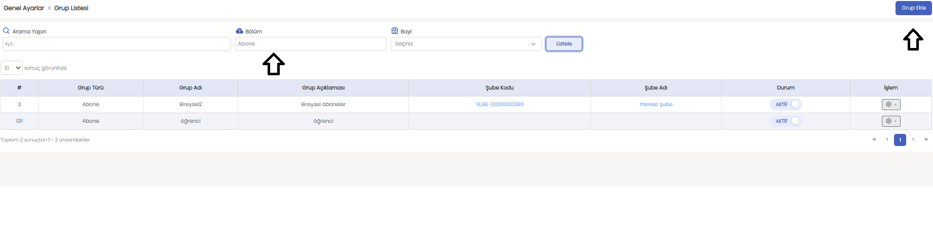Genel Ayarlar > Grup İşlemleri sayfasında yer alan “Bölüm” alanından “Abone” başlığını seçerek, abone gruplarınızı kolayca oluşturabilirsiniz.