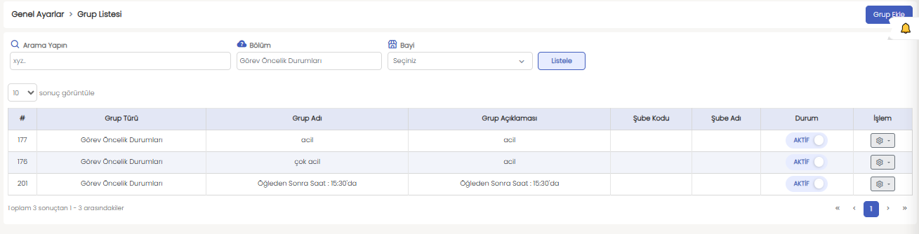Görev Öncelik Durumları eklemek için, Genel Ayarlar > Grup Listesi > Görev Öncelik Durumları sayfasına giderek sayfanın sağ üst köşesinde bulunan 'Grup Ekle' butonuyla eklemek istediğiniz bölümü seçerek yeni bir görev öncelik durumu ekleyebilirsiniz. Eklediğiniz görev öncelik durumunun sağ tarafında bulunan "işlem" alanının altındaki butonlara tıklayarak düzenleme işlemi sağlayabilirsiniz.