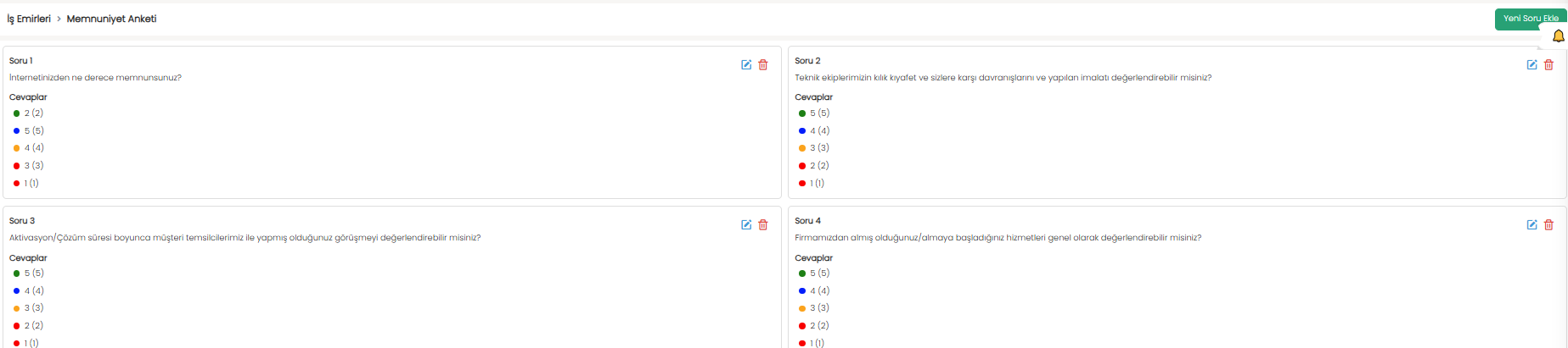 İş emri tamamlandığında, personel müşteriye soru–cevap şeklinde bir memnuniyet anketi sunarak geri bildirim toplayabilir. Bu ekran, memnuniyet anketi sorularını ve cevap seçeneklerini tanımlamak için kullanılır.