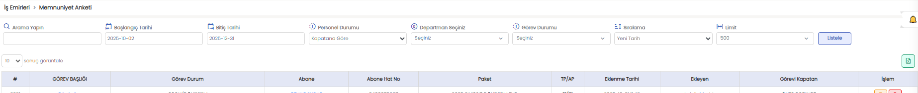 Memnuniyet anketlerine, İş Emirleri > Memnuniyet Anketleri sayfasından ulaşabilirsiniz. Bu sayfa üzerinden daha önce oluşturulan anket verilerini filtreleyebilir ve ihtiyaç halinde Excel çıktısı alabilirsiniz.