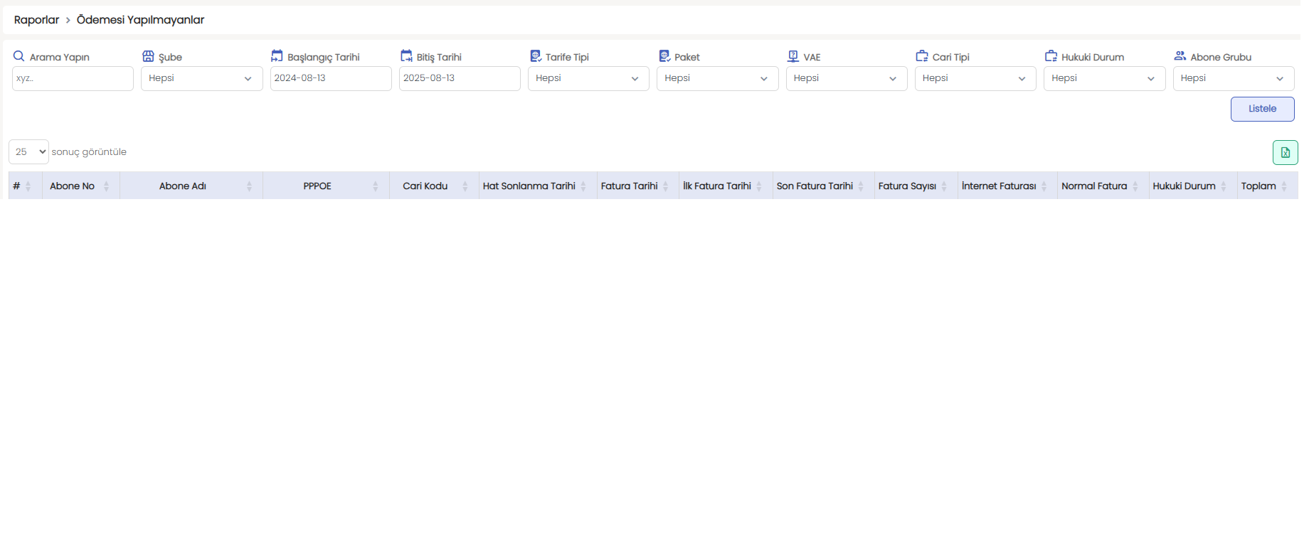 Ödenmemiş faturası olan aboneleri görüntüleyebilirsiniz.