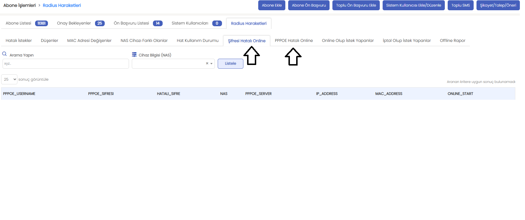 ISS İşlemleri > Abone Listesi > Radius Hareketleri > Şifre Hatalı Online / PPPoE Hatalı Online sayfasına girmeniz yeterlidir.