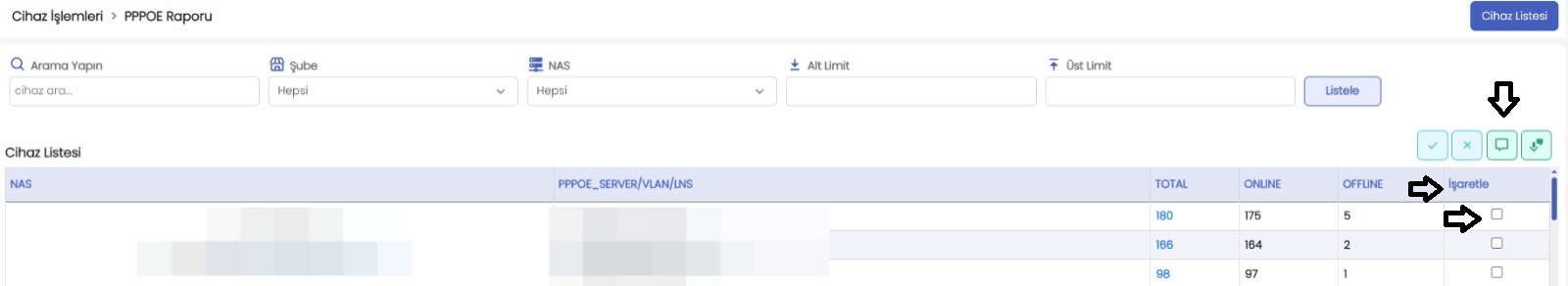 Bu özellik sayesinde belirli bir PPPOE server’a bağlı kullanıcılarla hızlı ve pratik bir şekilde iletişim kurabilir, bilgilendirme ya da duyurularınızı kolayca yapabilirsiniz.